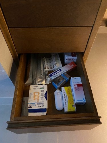 Im Bad ist eine kleine Notfall-Apotheke und Verbandszeug. Es gibt auch Kanülen und Skalpelle zur Entfernung von Seeigelstacheln.