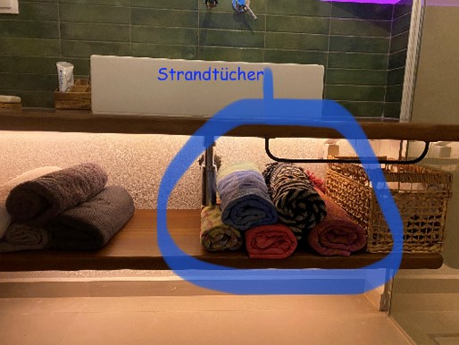 Im Badezimmer sind große und kleine Handtücher, sowie Badetücher für den Strand, bitte für das Baden im Meer nur die Strandtücher verwenden