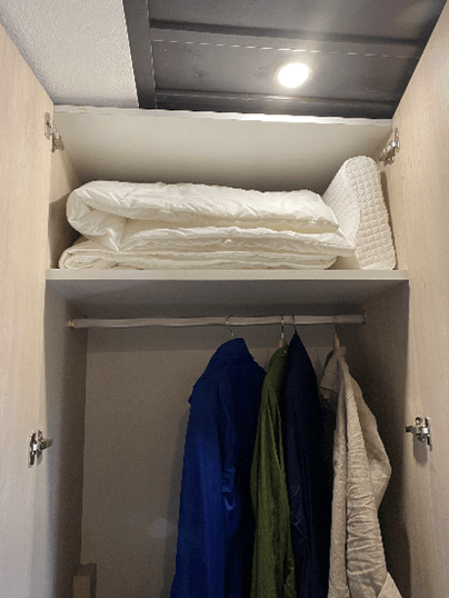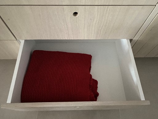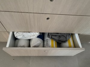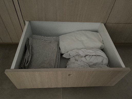 Ihr könnt eure Wäsche überall verstauen, wo ihr Platz findet. Aber nehmt wieder alles mit, wenn ihr abreist!