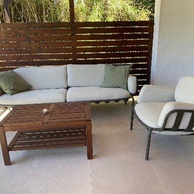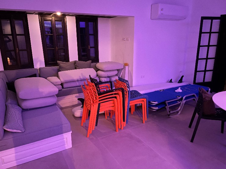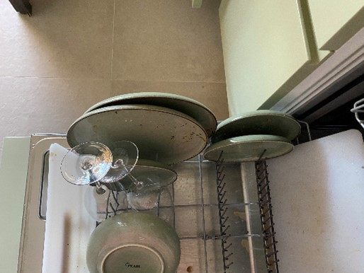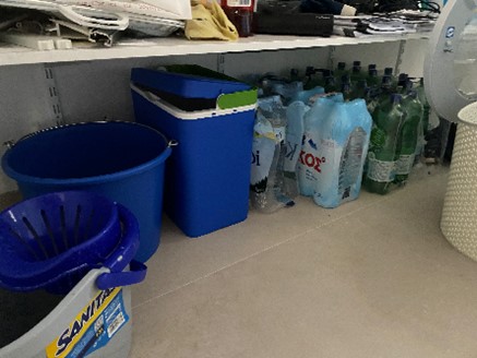 Im Wohnbereich bzw. auf der Terrasse stehen Dinge, die auf die Terrasse bzw. in den Garten gehören, siehe Fotos. Sie sind auch für euch nützlich, damit ihr alle Dinge wieder an ihre Plätze zurückstellen könnt.