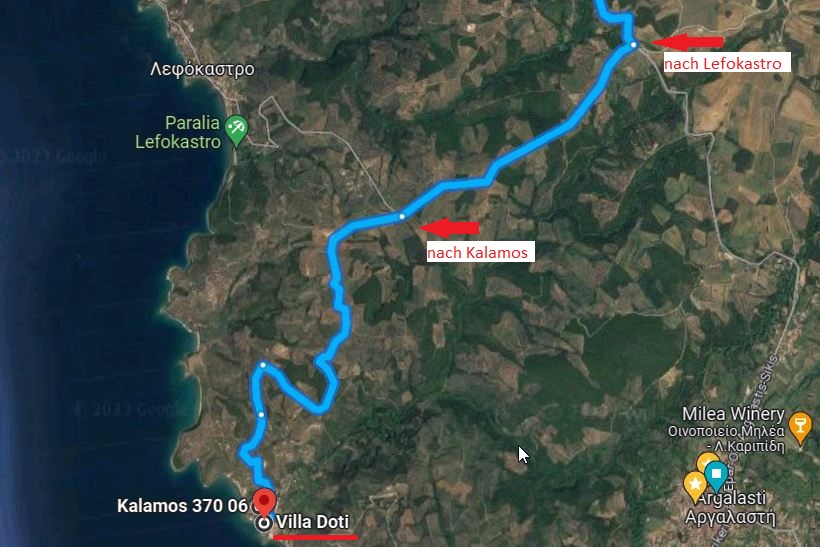 Achtung in letzter Zeit führt Google einen entlang der Küste – schön aber an einer Stelle extrem eng. Wir empfehlen als Zwischenziel Argalasti einzugeben und kurz vor Argalasti Richtung Lefokastro abbiegen. Dann wieder Google folgen!